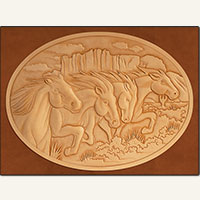 This is the oval cover pattern with horses from F. O. Baird's Leather Secrets book that has been re-tooled by Charlie Davenport. Charlie is Tandy Leather's Director of Research and Development. Approx. size is 12'' x 9" but the tracing pattern can be scaled up or down as desired.